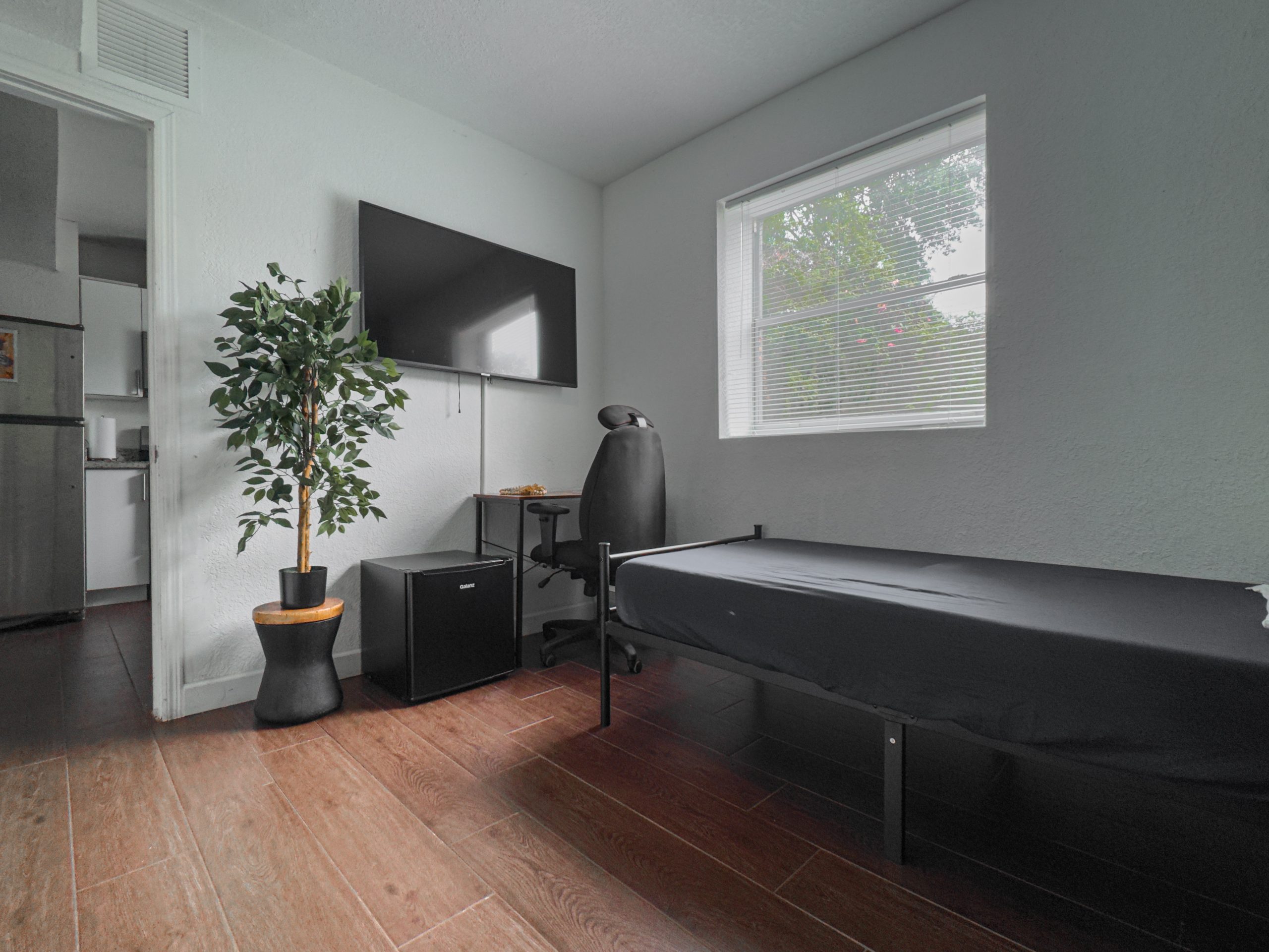 Efficiently designed room with a twin-size bed, perfect for budget-conscious individuals. Features smart TV, mini fridge, desk space, and shares a bathroom with other residents. Ideal for short-term stays or minimalist living.