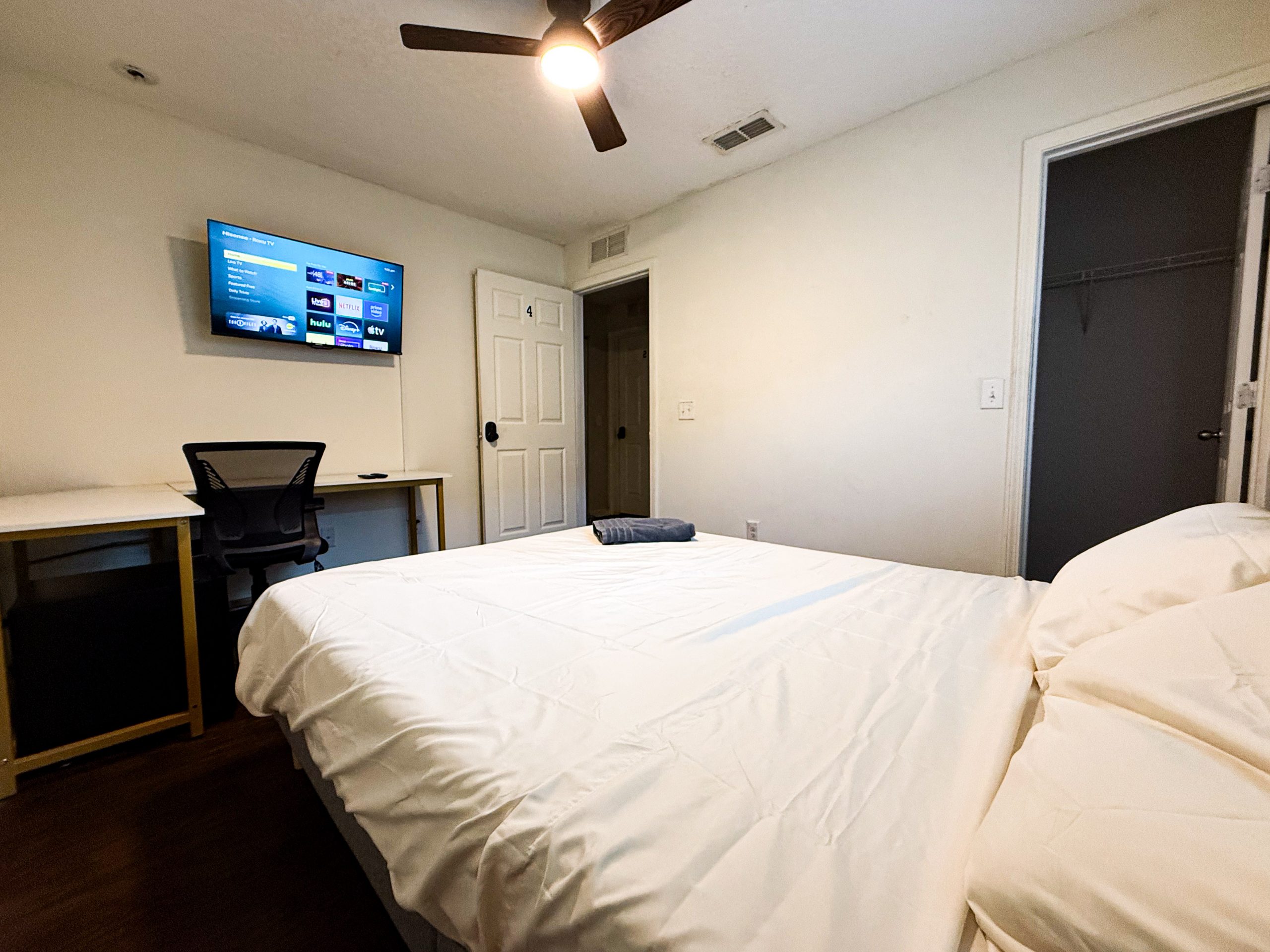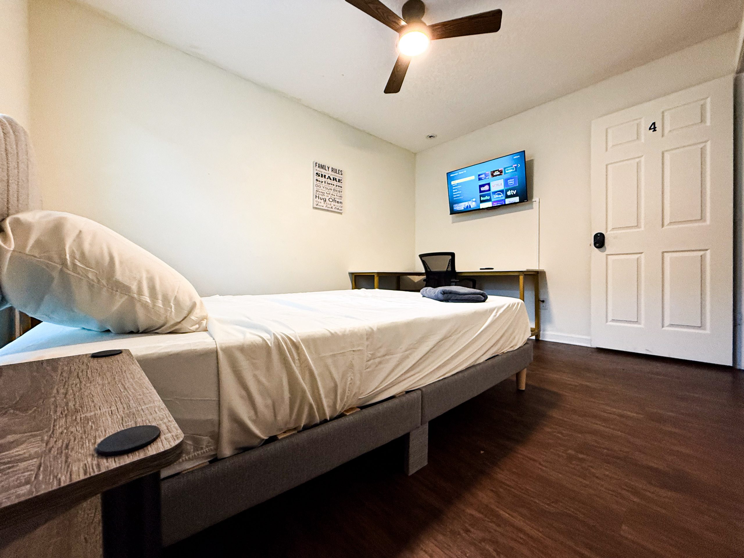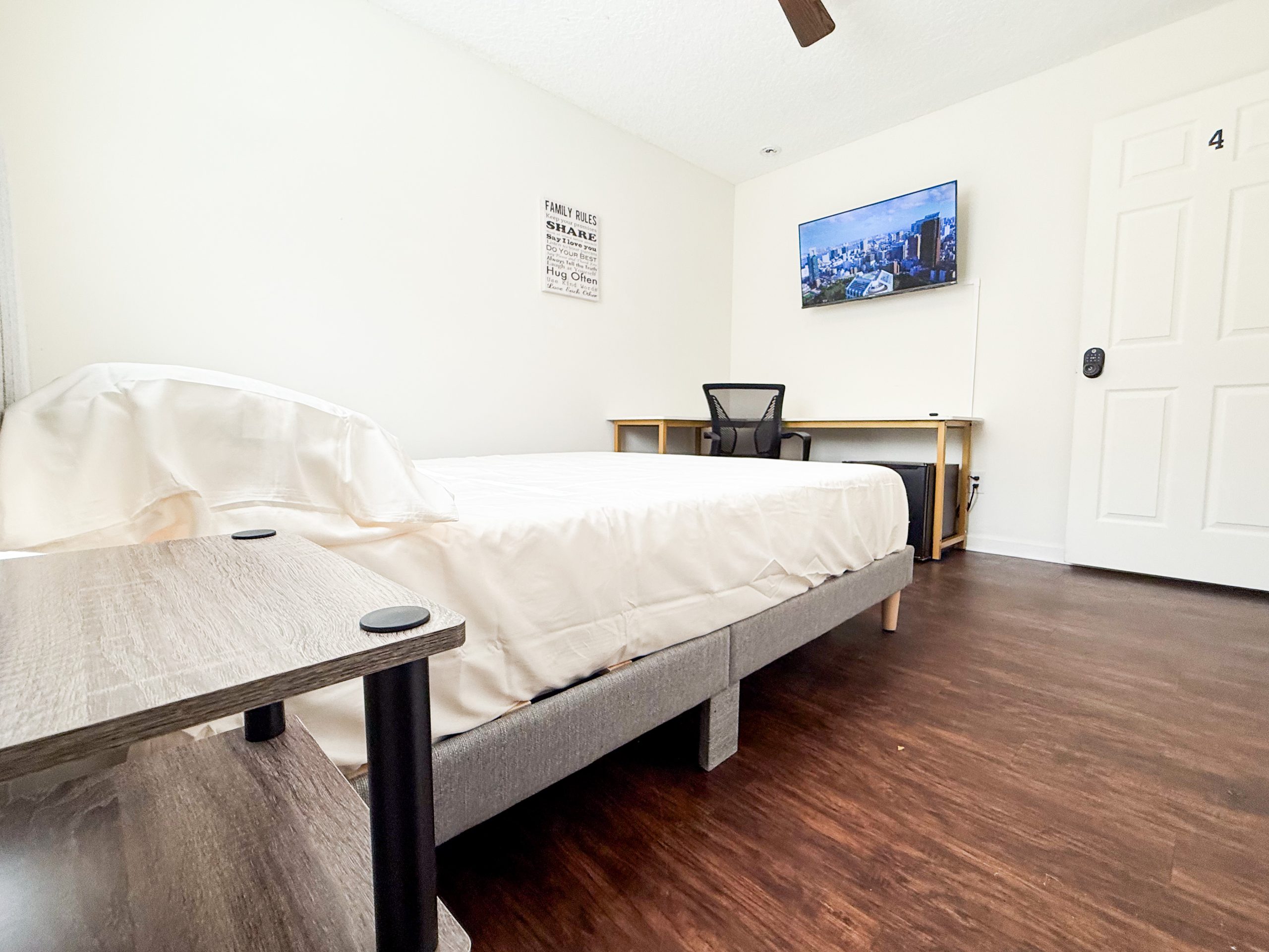 Bright and inviting room with a full-size bed designed for comfort and convenience. Enjoy your private space with generous storage, dedicated workspace, and access to a shared bathroom. Perfect for professionals or students looking for a hassle-free living arrangement in a friendly home environment.